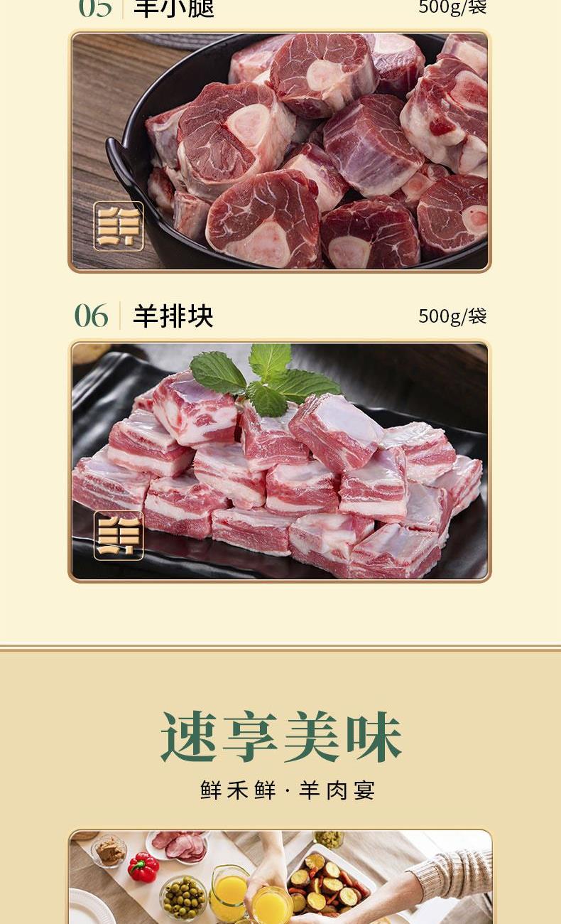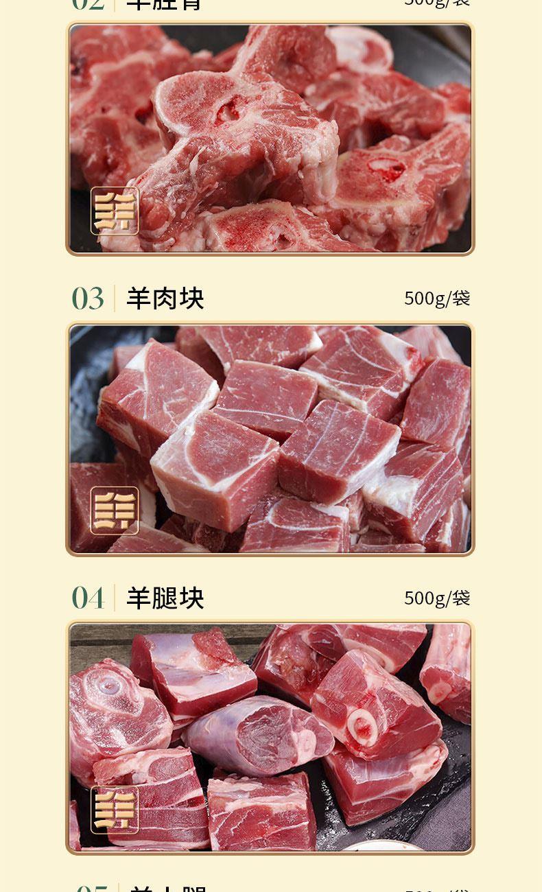 克重:3000g 內(nèi)蒙羊蝎子500g×1袋 內(nèi)蒙羊脛骨500g×1袋 內(nèi)蒙羊肉塊500g×1袋 內(nèi)蒙羊腿塊500g×1袋 內(nèi)蒙羊小腿500g×1袋 內(nèi)蒙羊排塊500g×1袋