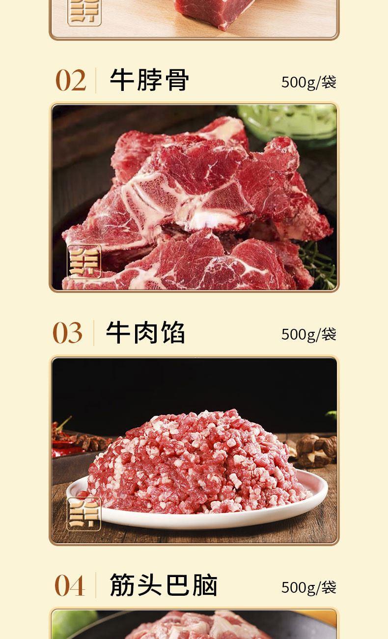 克重:2000g 牛腩 500g×1袋 牛肉餡500g×1袋 牛脖骨500g×1袋 筋頭巴腦500g×1袋