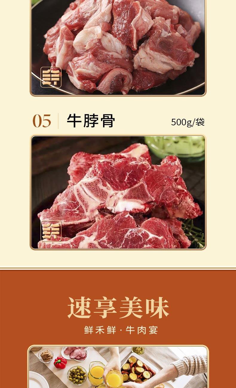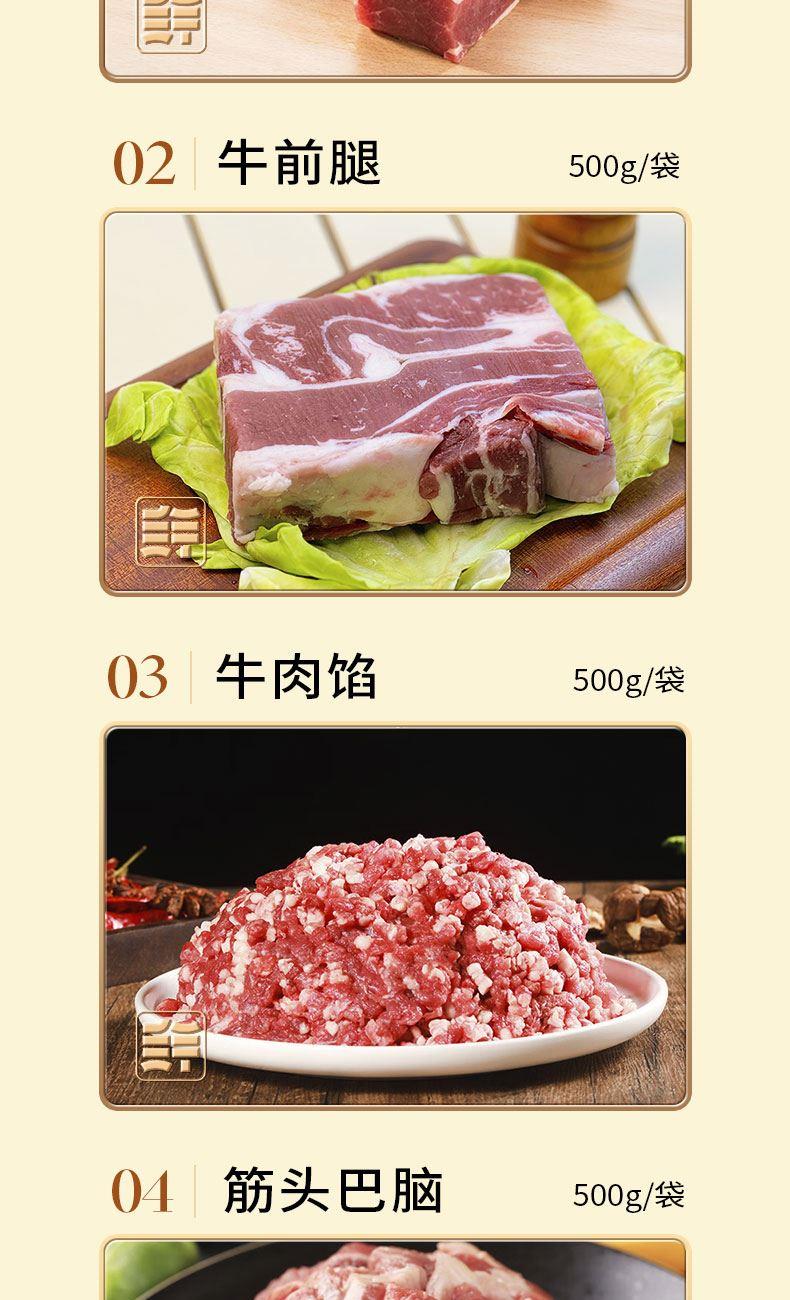 克重:2500g 牛腩 500g×1袋 牛前腿500g×1袋 牛肉餡500g×1袋 牛脖骨 500g×1袋  筋頭巴腦500g×1袋